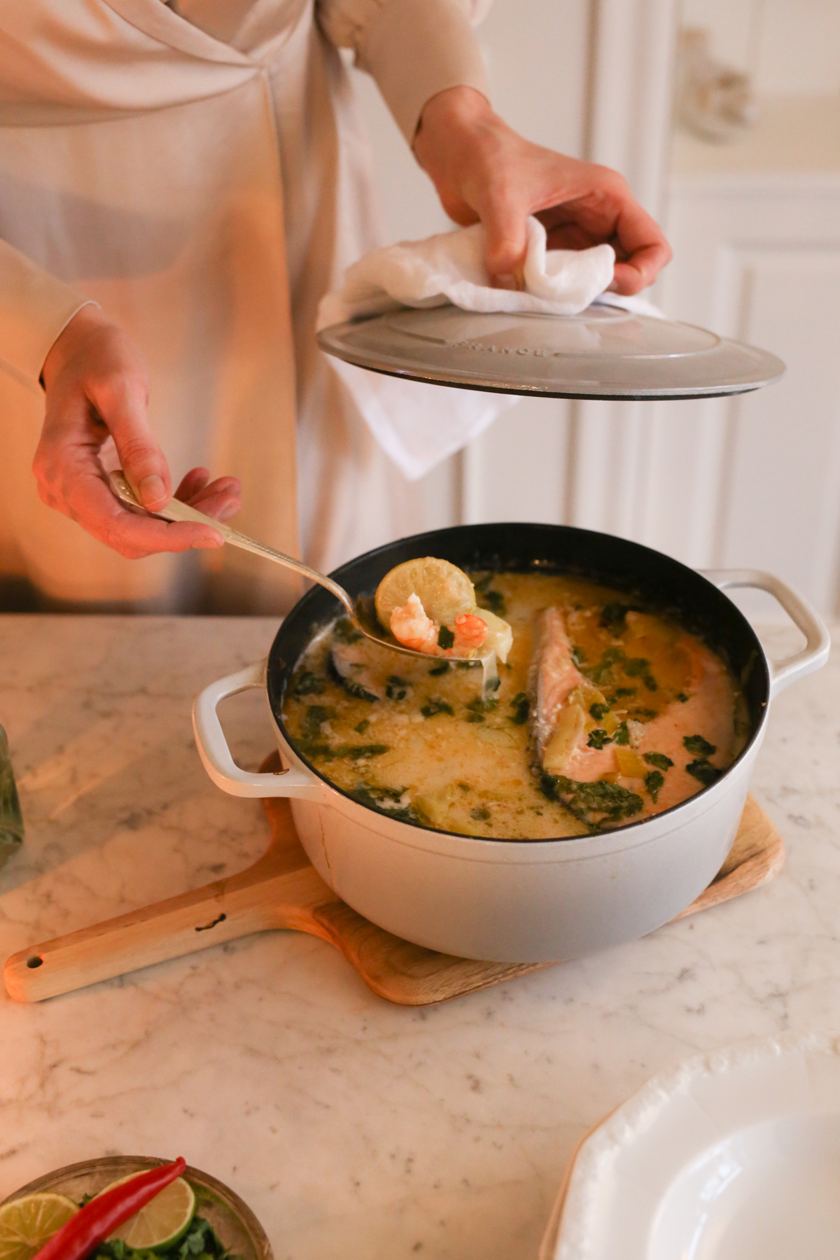 - W żaroodpornym garnku na oleju roślinnym podsmażamy posiekanego pora, czosnek, papryczkę chili oraz imbir. Całość zalewamy wywarem i dodajemy pstrąga oraz dzwonka łososia. Gotujemy na małym ogniu przez kilka minut. Ugotowane ryby ostrożnie wyjmujemy z wywaru i usuwamy z nich ości oraz skórę. W małej miseczce rozcieńczamy mleko kokosowe z jedną chochlą wywaru. Całość przelewamy z powrotem do garnka, dodajemy kawałki ryb, zanurzamy obrane krewetki i doprawiamy zupę sokiem z limonki. Zupę pozostawiamy na małym ogniu przez 3-4 minuty, aż krewetki nabiorą różowego koloru.