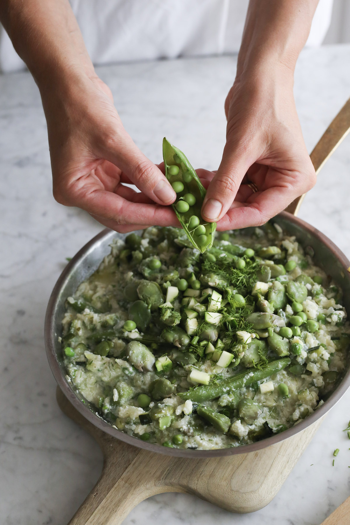 Zielone risotto z bobem, groszkiem cukrowym i ricottą