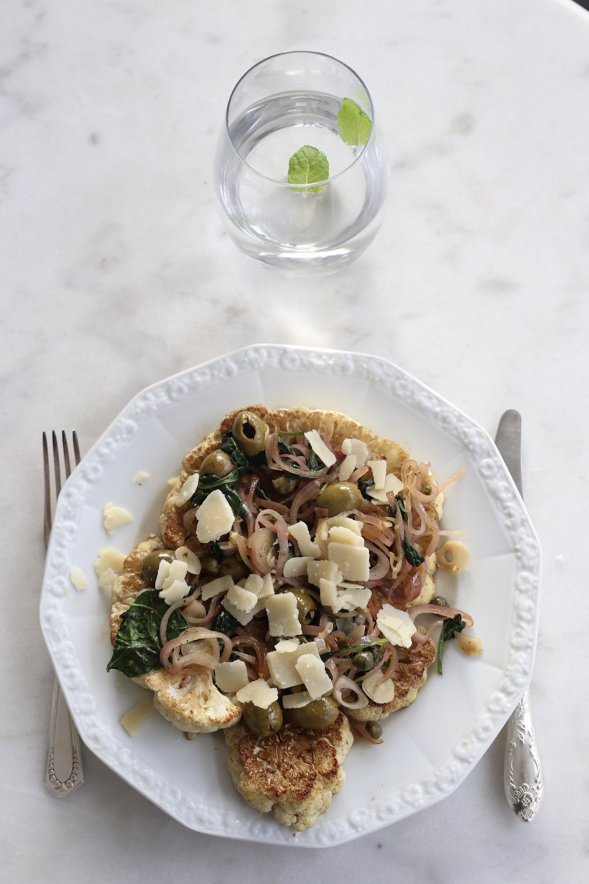 Kalafiorowy stek z dużą ilością soczystych warzyw