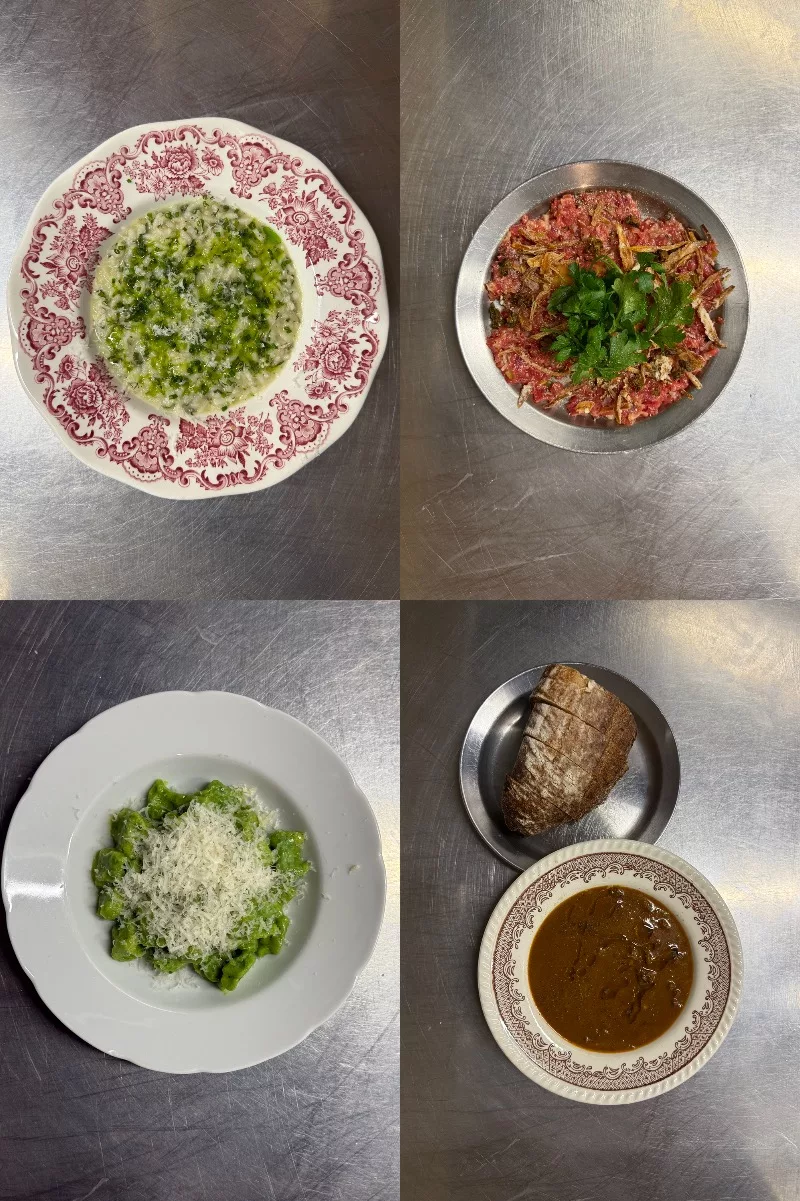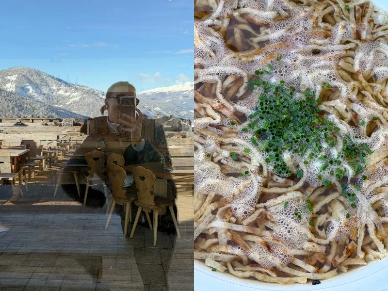 Frittatensuppe. Alpejski klasyk. Najlepszy wybór w momencie, gdy nie jesteście jeszcze gotowi na sznycle, kiełbasy, gulasze czy kaiserschmarrn, choć ta perspektywa już gdzieś się pojawia. Lekki, klarowny bulion i cienko krojone naleśniki tworzą danie idealnie wyważone: rozgrzewa, syci bez ciężkości i pozwala wrócić do jazdy z energią. PS. Gdyby ktoś pytał – przepis znajdziecie w mojej książce.