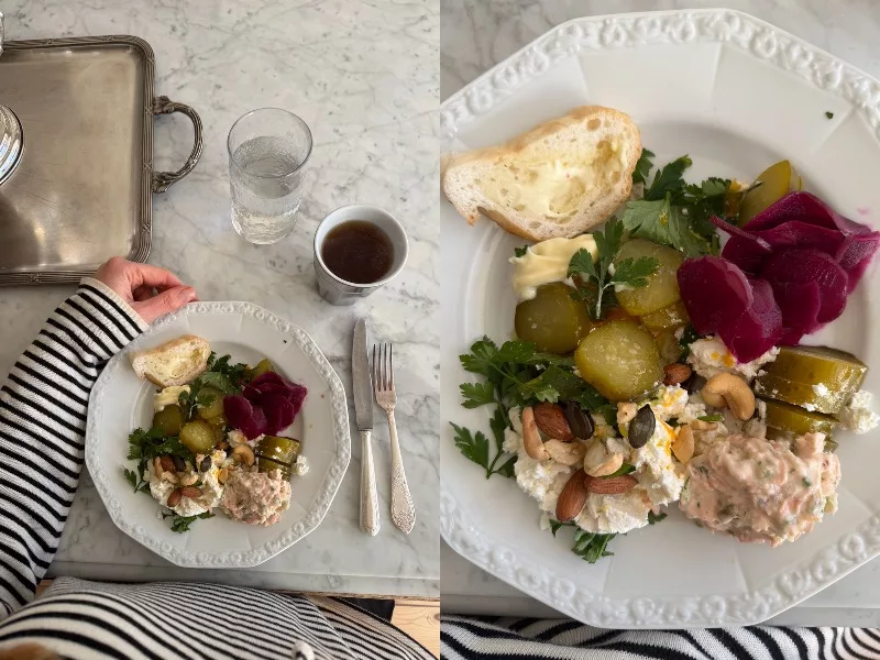 Powroty do ulubionych śniadań: kiszone buraki, pasta łososiowa, twaróg z prażonymi migdałami i olejem z czarnuszki pietruszka, ogórki kiszone i gorący bulion kolagenowy.