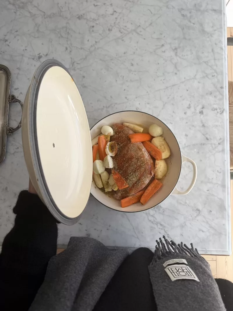 A na koniec dla wszystkich, którzy dotrwali tu, mój as z rękawa na mroźne dni – pieczony indyk, który robi się praktycznie sam. Mięso (najczęściej kupuję dużą pierś z polędwiczką) obkładam jabłkami lub gruszkami, dodaję marchewkę i cebulę, a całość nacieram majerankiem albo oregano. Wlewam odrobinę wody i oliwy, po czym piekę w piekarniku nagrzanym do 180°C przez około 1,5 godziny. Na sam koniec doprawiam solą i – jeśli mam ochotę – dorzucam kawałek masła dla smaku.