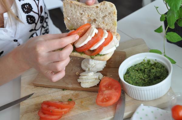 … nie ma lepszego sposobu w ciągu dnia na zaspokojenie głodu, niż własnoręcznie przygotowywana kanapka z pesto, wsuniętymi pomidorami i kilkoma plastrami sera mozzarella. Mieszkając spory okres poza domem, pomidory z mozzarellą były wpisane na stałe w moje codziene menu. Prawie do znudzenia! Aż w pewnym momencie, w biegu wpadłam na małą restauracyjkę i pozazdrościłam im ogromnych kanapek z różnymi pysznościami. Jedną z nich, była właśnie świeża bagietka z pesto. Szybko czmychnęłam do domu i sama spróbowałam dorównać temu cudu.