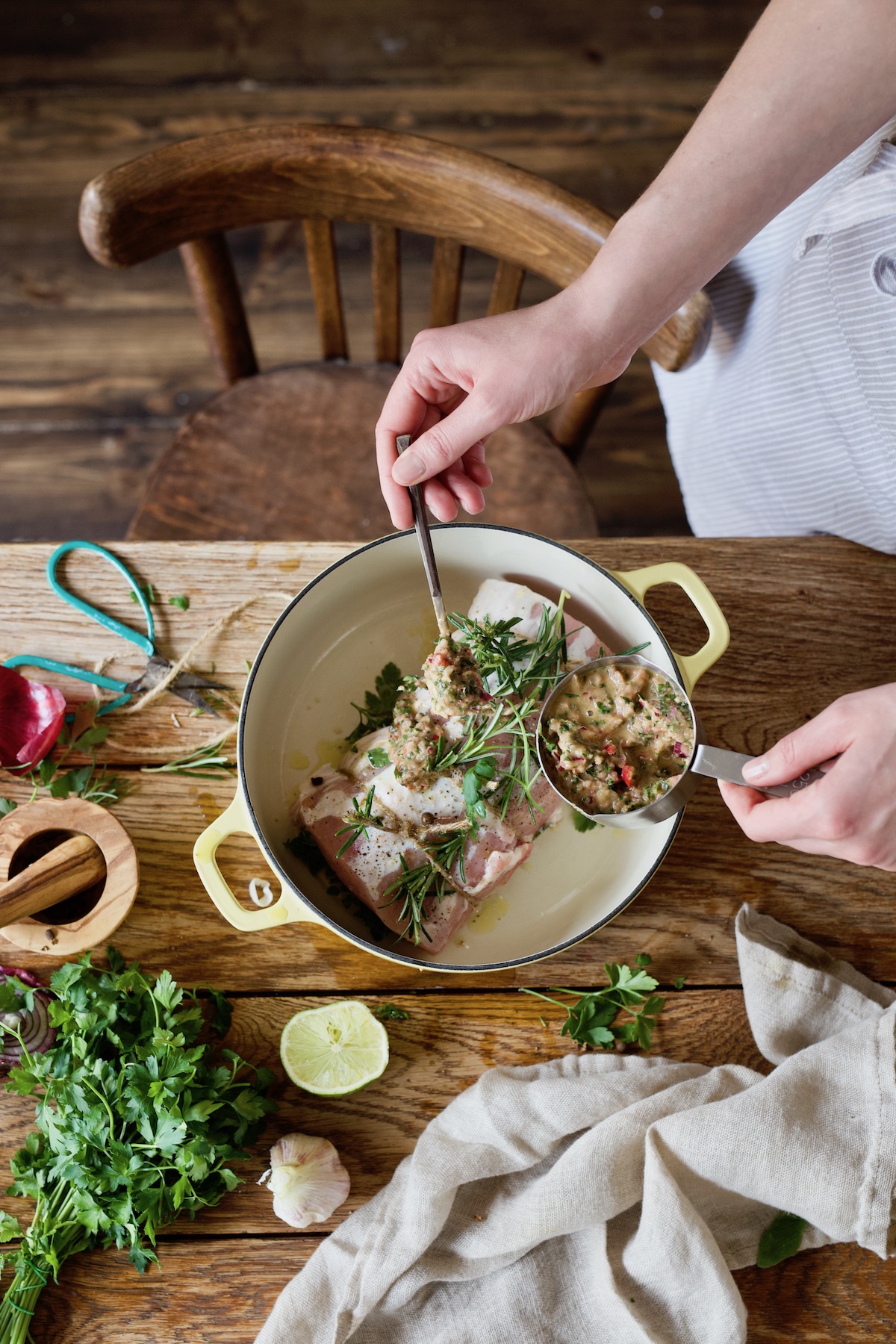 1. Na dzień przed pieczeniem (najlepiej wieczorem) umyte i osuszone mięso nacieramy solą i nakłuwamy gałązkami rozmarynu. Ostrym nożem przecinamy w połowie mięso – do środka dodajemy posiekaną pietruszkę, ziele angielskie, plastry czosnku, skórkę otartą z limonki i kilka kropel oliwy. Tak przygotowane mięso obwiązujemy sznurkiem. Umieszczamy w żeliwnym garnku i polewamy marynatą (poniżej przepis).