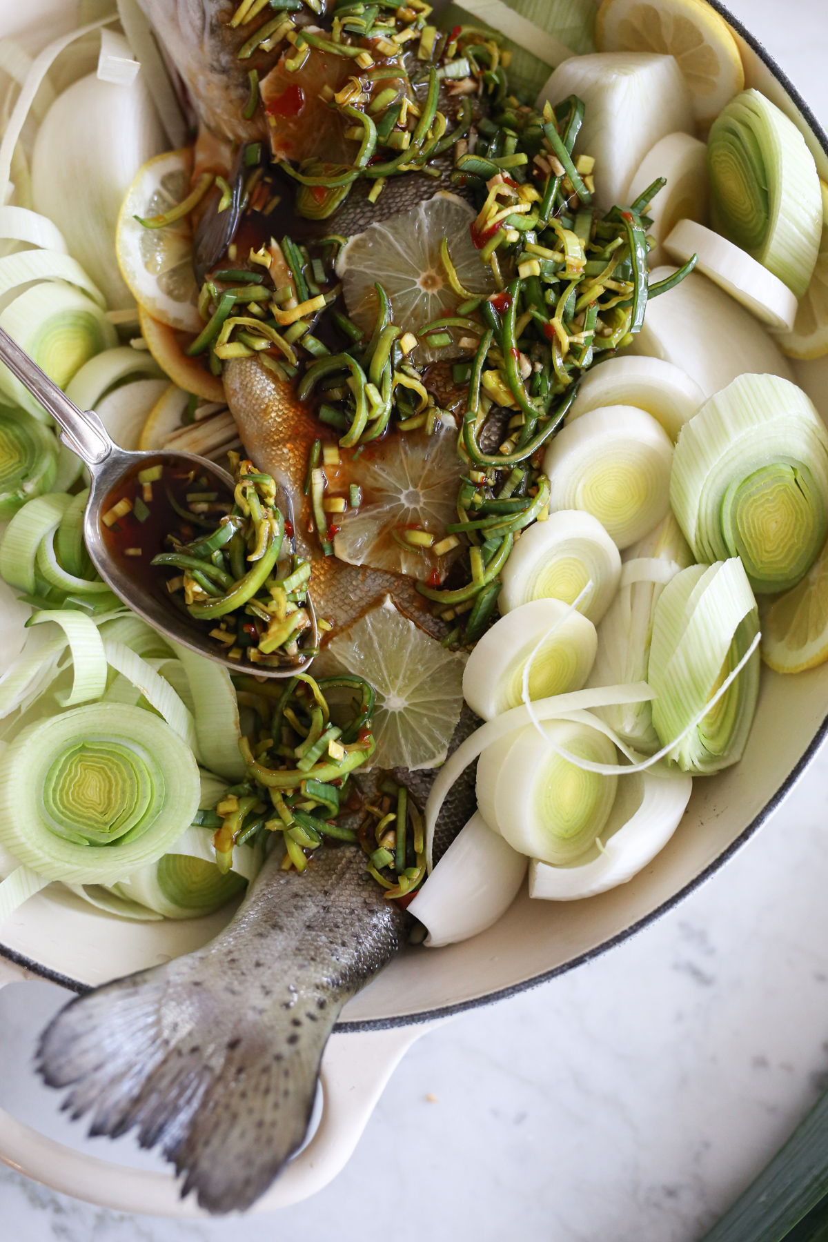 Pstrąga dokładnie myjemy i rozkładamy w naczyniu żaroodpornym. Do środka ryby umieszczamy cienko pokrojone kawałki imbiru (imbir najlepiej pokroić w tzw. słupki). Rybę obkładamy grubymi plastrami pora i ćwiartkami cebuli.