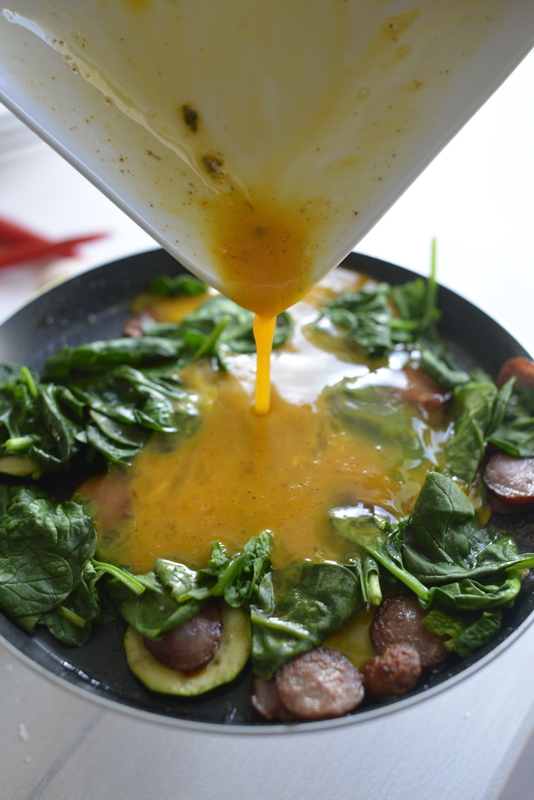 1. Na małym ogniu podsmażamy plasterki kiełbaski, dodajemy cukinię i kawałki papryczki chili. Doprawiamy suszonym oregano. Następnie dorzucamy zblanszowany szpinak i wyciśnięty czosnek. Doprawiamy solą i pieprzem. Całość smażymy ok. 2 minuty. Odstawiamy z ognia.