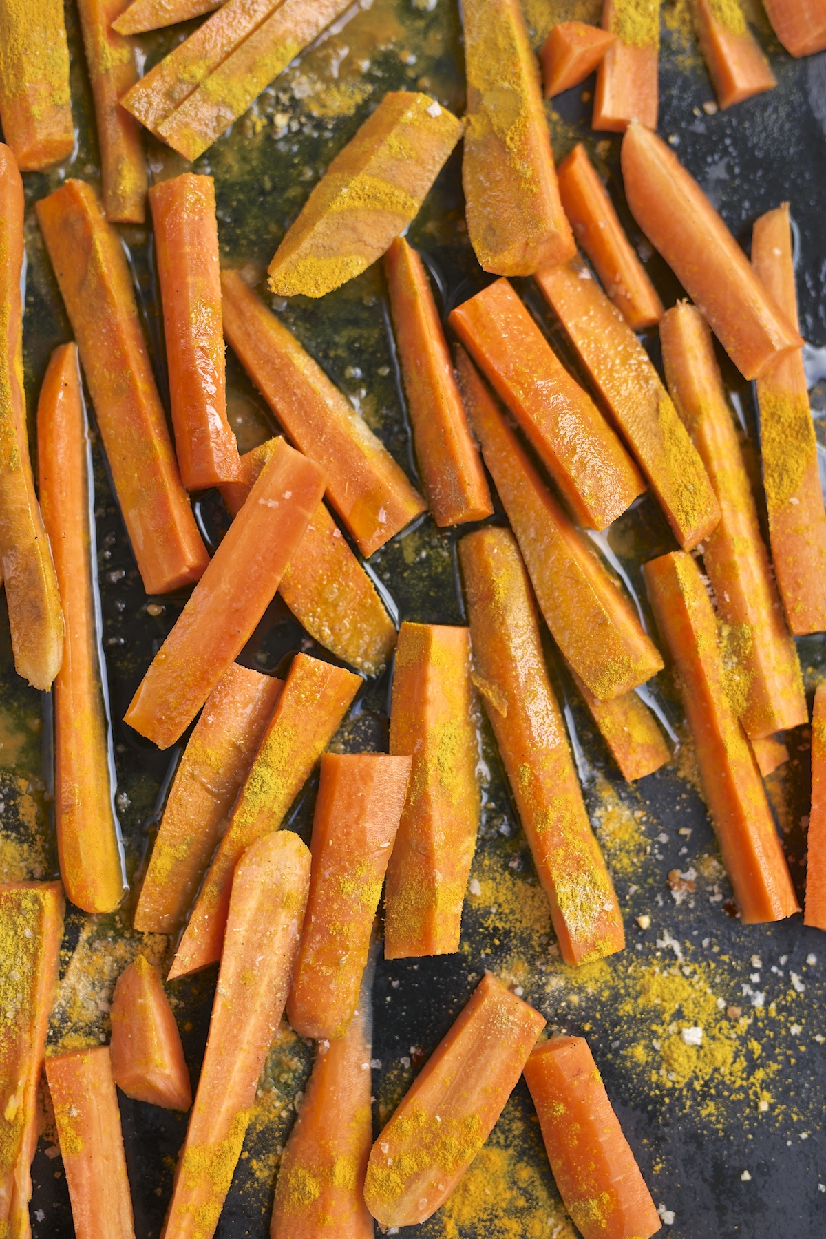 Umytą i obraną marchew kroimy w podłużne kawałki i rozkładamy na blasze. Posypujemy curry, mielonym imbirem, kurkumą i solą. Skrapiamy oliwą z oliwek. Pieczemy w rozgrzanym piekarniku w 200 stopniach C przez 8-10 minut.