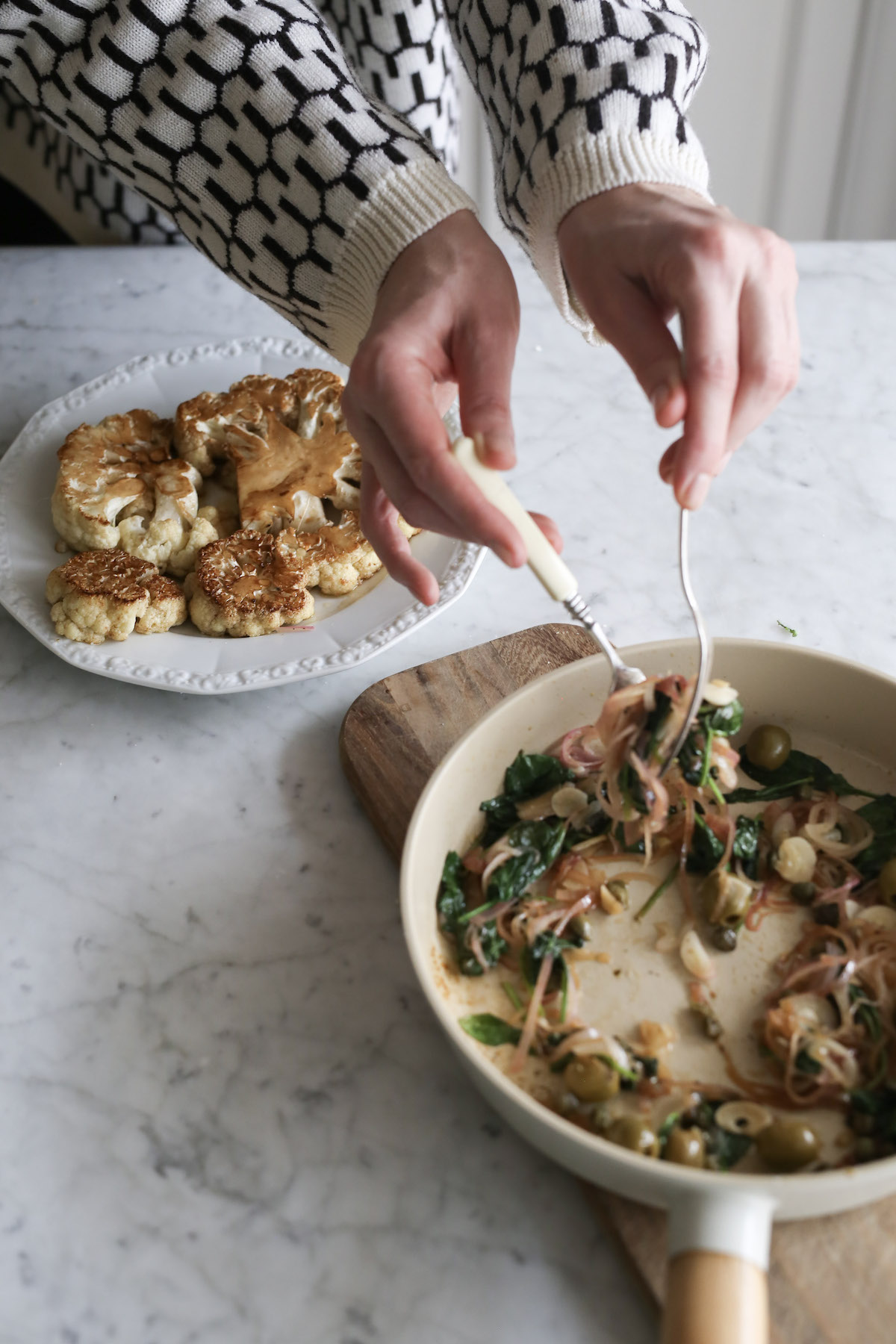 - Na rozgrzanej patelni z oliwą podsmażamy kawałki kalafiora po 2 minuty z każdej strony (uwaga, tłuszcz może pryskać, polecam skorzystać z przykrywki). Odstawiamy. Na tym samym tłuszczu podsmażamy posiekaną szalotkę, kapary, oliwki i szpinak. Doprawiamy świeżo zmielonym pieprzem i szczyptą soli. Możemy dolać resztę marynaty.