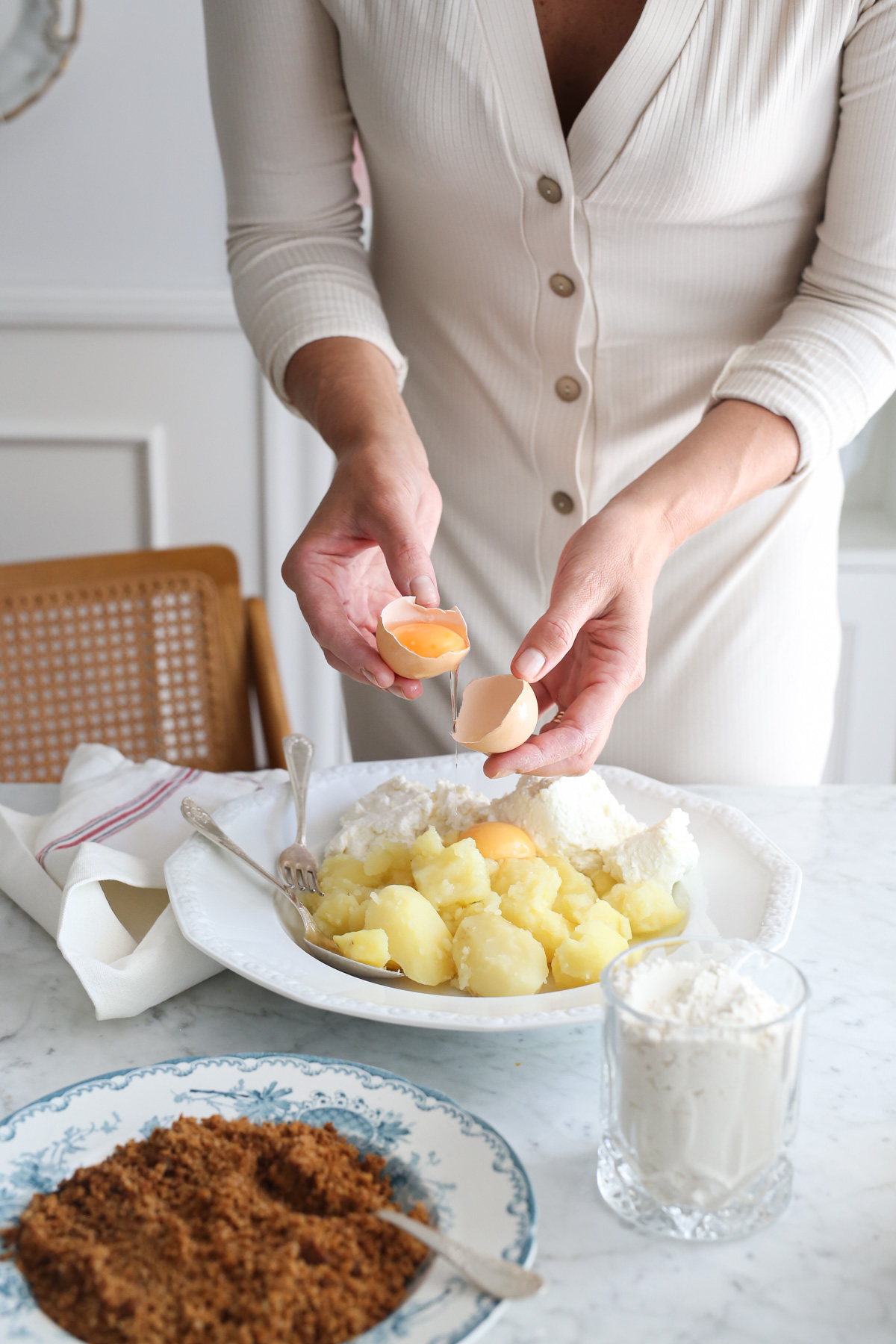 1. Umyte i obrane ziemniaki gotujemy w osolonej wodzie. Ugotowane odcedzamy i miksujemy na puree. Ważne, by ziemniaki były zimne, bo inaczej ciasto będzie nam się kleić do rąk.
