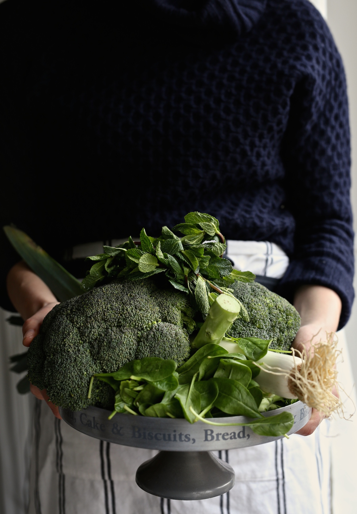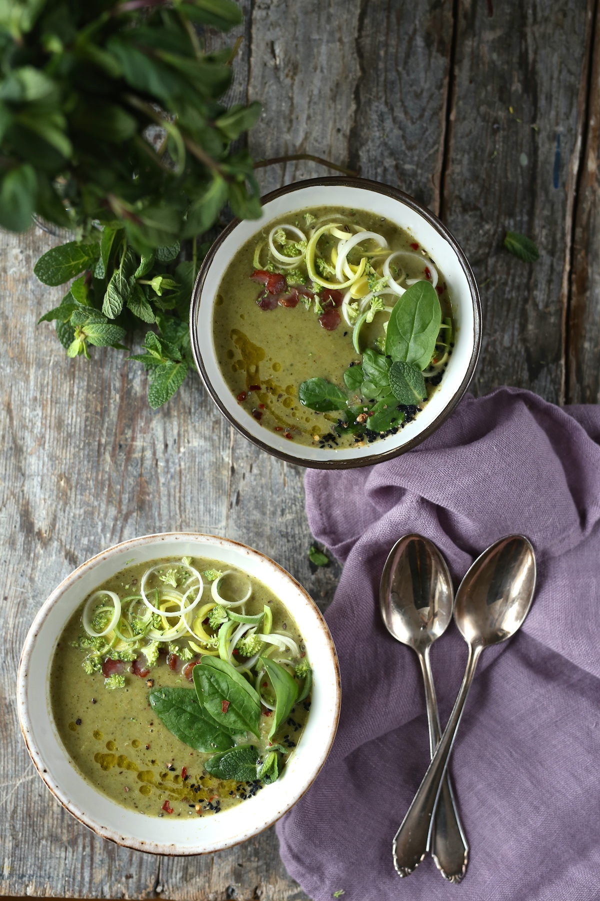 - Na rozgrzanej patelni podsmażamy boczek, posiekany czosnek, por, pokrojone w kostkę ziemniaki, paprykę chili i liście szpinaku. Dodajemy brokuły i lekko przesmażamy. Następnie całość zalewamy wodą lub bulionem, doprowadzamy do wrzenia, zmniejszamy płomień i gotujemy ok. 18-20 minut. Całość blendujemy na gładki krem. Doprawiamy świeżo zmielonym pieprzem i solą. Podajemy z liśćmi świeżej mięty i kroplami pikantnej oliwy.