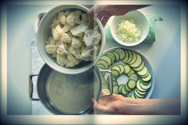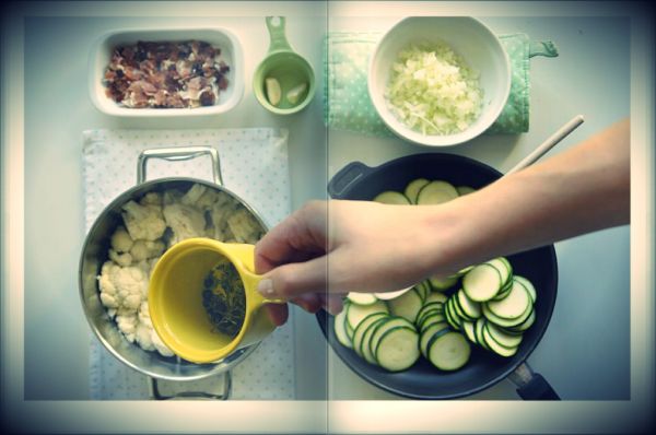 1. Cukinię kroimy w takarki, a kalafiora rozbieramy na tzw. różyczki. Oliwę rozgrzewamy na patelni dodajemy pokrojoną cebulę, talarki cukinii, rozgnieciony czosnek, świeży tymianek i podsmażamy do momentu, aż warzywa zmiękną. W międzyczasie różyczki kalafiora umieszczamy w szerokim garnku, zalewamy gorącą wodą aż po wierzch kalafiora i dodajemy liście laurowe, ziarenka pieprzu, ziela angielskiego i szczyptę soli. Całość doprowadzamy do wrzenia, a następnie gotujemy ok. 10-12 minut.
