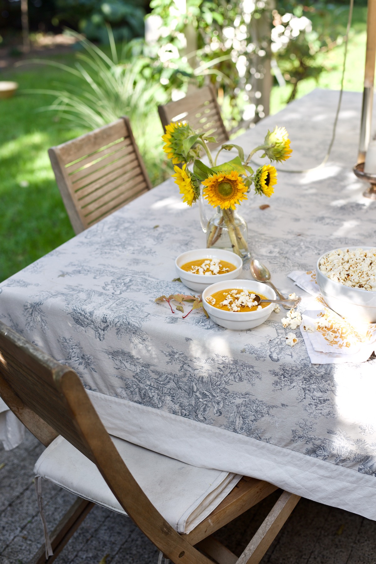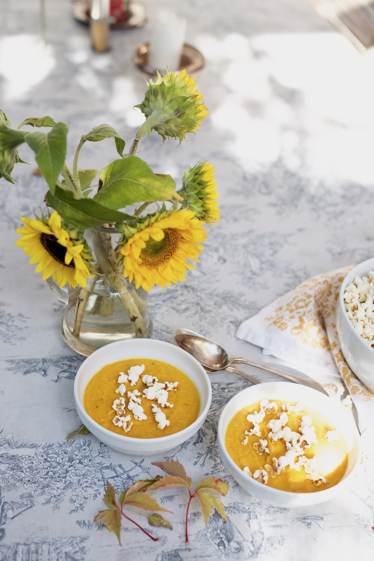 - Warzywa wyjmujemy z piekarnika, czekamy aż ostygną i przekładamy do żeliwnego garnka. Zalewamy wodą, doprowadzamy do wrzenia i gotujemy 10 minut, do uwolnienia się smaków. Odstawiamy z ognia i dodajemy masło, sok pomarańczowy i jogurt. Całość blendujemy partiami. Doprawiamy gałką muszkatołową, solą i pieprzem. Krem podajemy z popcornem.