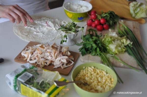 2. tortillę kładziemy na blacie i smarujemy nią mieszaniną jogurtu. Nakładamy kurczaka, kawałki sałaty i kiełki. Rolujemy i kroimy na 2 kawałki. Zawijamy w folię przed podróżą.