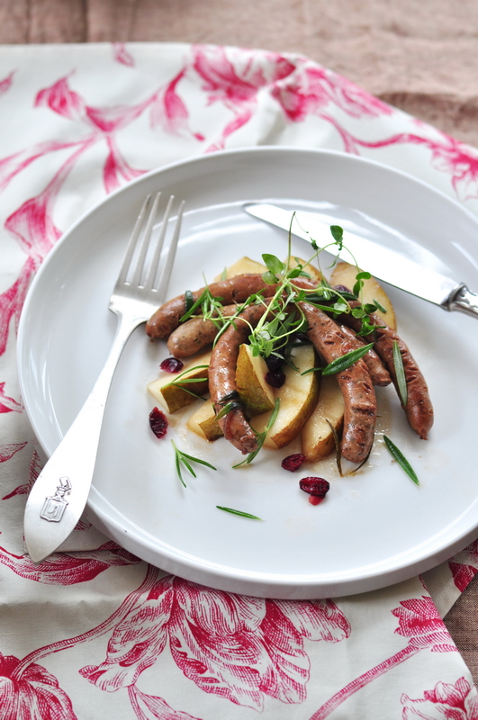Biała kiełbasa z gruszkami, żurawiną i świeżym rozmarynem. Duszona w sosie piwnym.