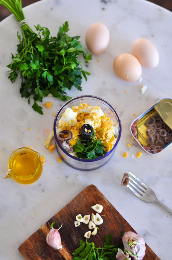 Uwielbiam pasty! Najczęściej miksuję to co mam pod ręką i w efekcie końcowym mam wspaniały dodatek do chleba, ziemniaków, naleśników lub makaronu. Po poworcie z podróży marzyłam o prostym daniu, a pasta z ugotowanych na twardo jajek, pietruszki, czosnku i odrobiny anchois doskonale pasuje do młodych ziemniaków. Jeżeli końcowy smak może wydawać nam się nieco mdły, przełammy go sokiem z cytryny. Uważajmy z solą – anchois same w sobie są słone.