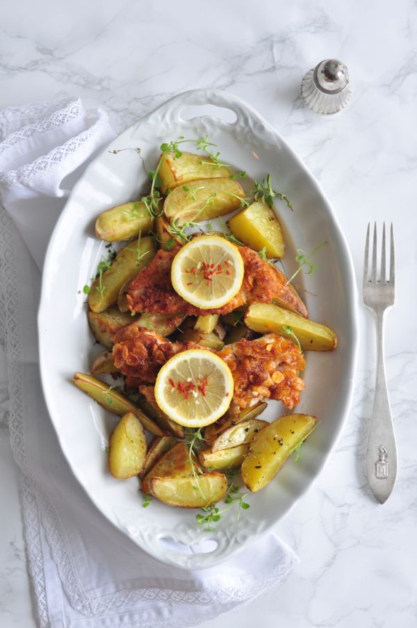 Pomysł na szybki obiad. Kawałki indyka zanurzam w roztrzepanym jajku i panierce z płatków kukurydzianych (bezglutenowych) zmieszanych z suszonym chili peperoncini. Ziemniaki posypuje otartą skórką z cytryny, doprawiam solą morską i gałązkami świeżego tymianku. Na co dzień mam często ochotę na proste i niewyszukane danie, zatem ta propozycja całkiem znośnie się wpisuje w moje oczekiwania.