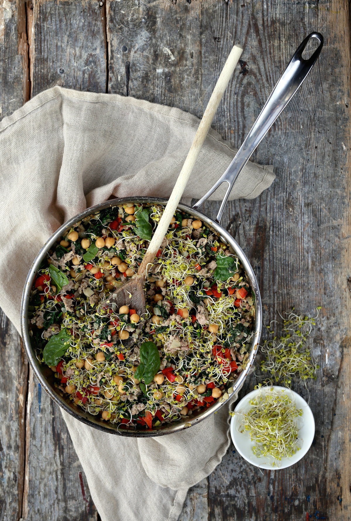 - Aby przygotować farsz: na rozgrzanej patelni podsmażamy posiekaną cebulę i czosnek. Dodajemy mięso i pokrojoną w kostkę czerwoną paprykę. Doprawiamy solą, pieprzem i gałką muszkatołową. Odstawiamy z ognia i dorzucamy świeże kiełki, odsączoną ciecierzycę i umyte liście szpinaku. Całość mieszamy do połączenia się składników.