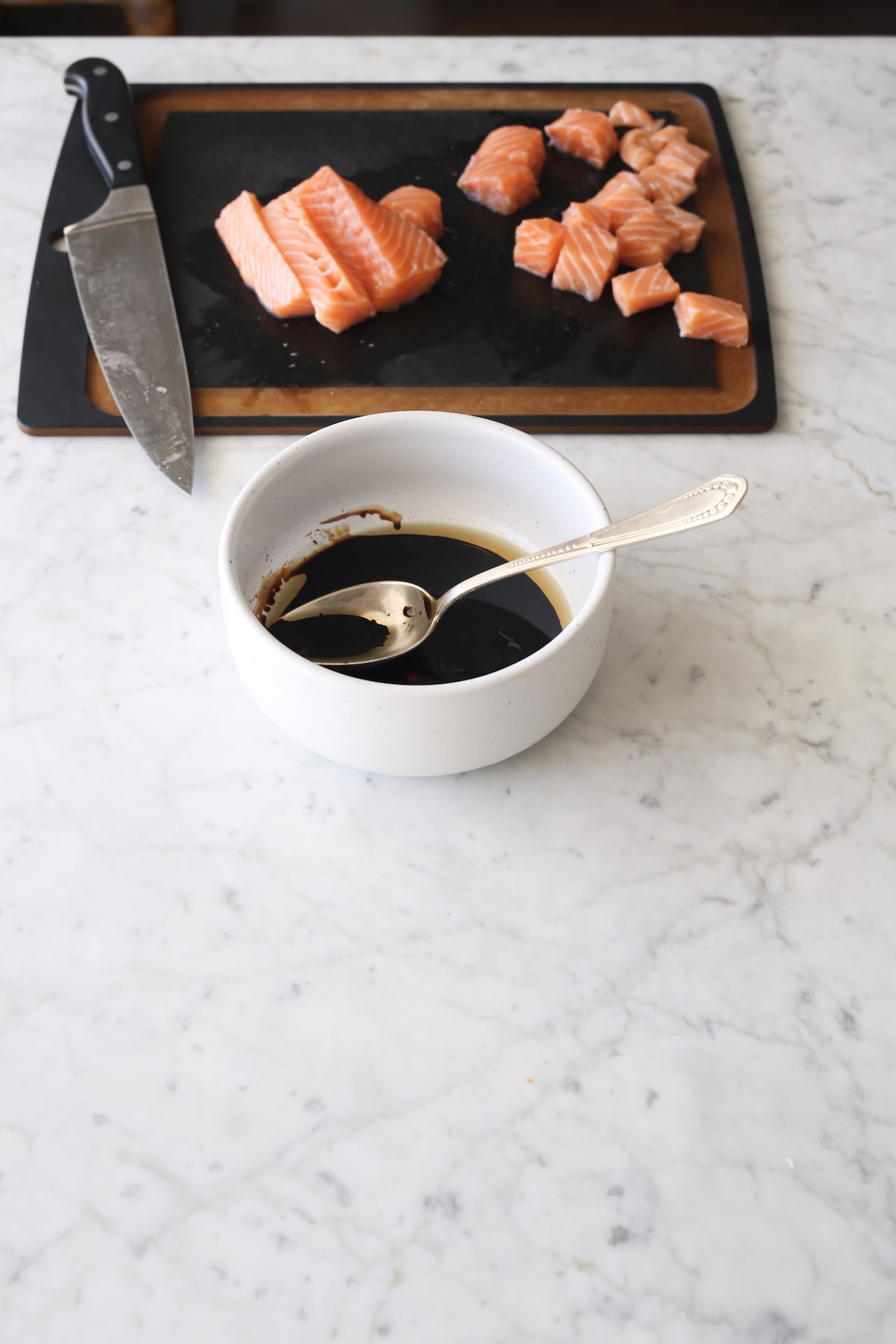 - W średnim naczyniu łączymy sos sojowy z olejem sezamowym. Dodajemy kawałki pokrojonego łososia i sezam. Całość marynujemy min. 10 minut.