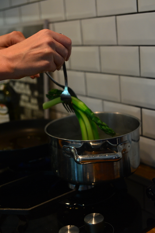 1. Szparagi należy dokładnie opłukać i odłamać zdrewniałe końce – powinny się same ułamać w odpowiednim miejscu ( ja dodatkowo obieram ze skórki, ale nie jest to wymagane przy zielonych szparagach). Następnie umieszczamy w gorącej osolonej wodzie, dodajemy 1 łyżkę cykru i gotujemy ok. 4-5 minut. Wyjmujemy, odcedzamy i przekładamy na rozgrzaną patelnię z oliwą z oliwek. Podsmażamy z każdej strony ok. 1 min.