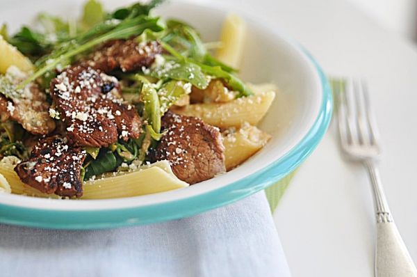 3. Makaron odcedzamy, łączymy z sosem serowym, dodajemy kawałki usmażonego mięsa i liście rukoli. Całość posypujemy świeżo startym parmezanem.