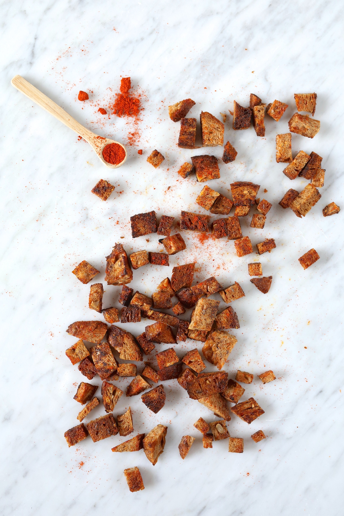 Warzywa podajemy z domowymi grzankami z wędzoną papryką