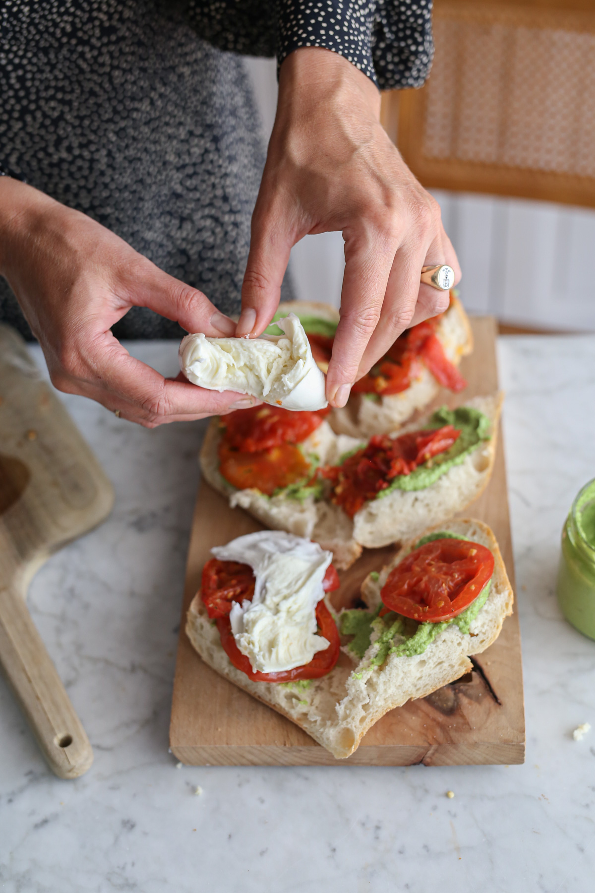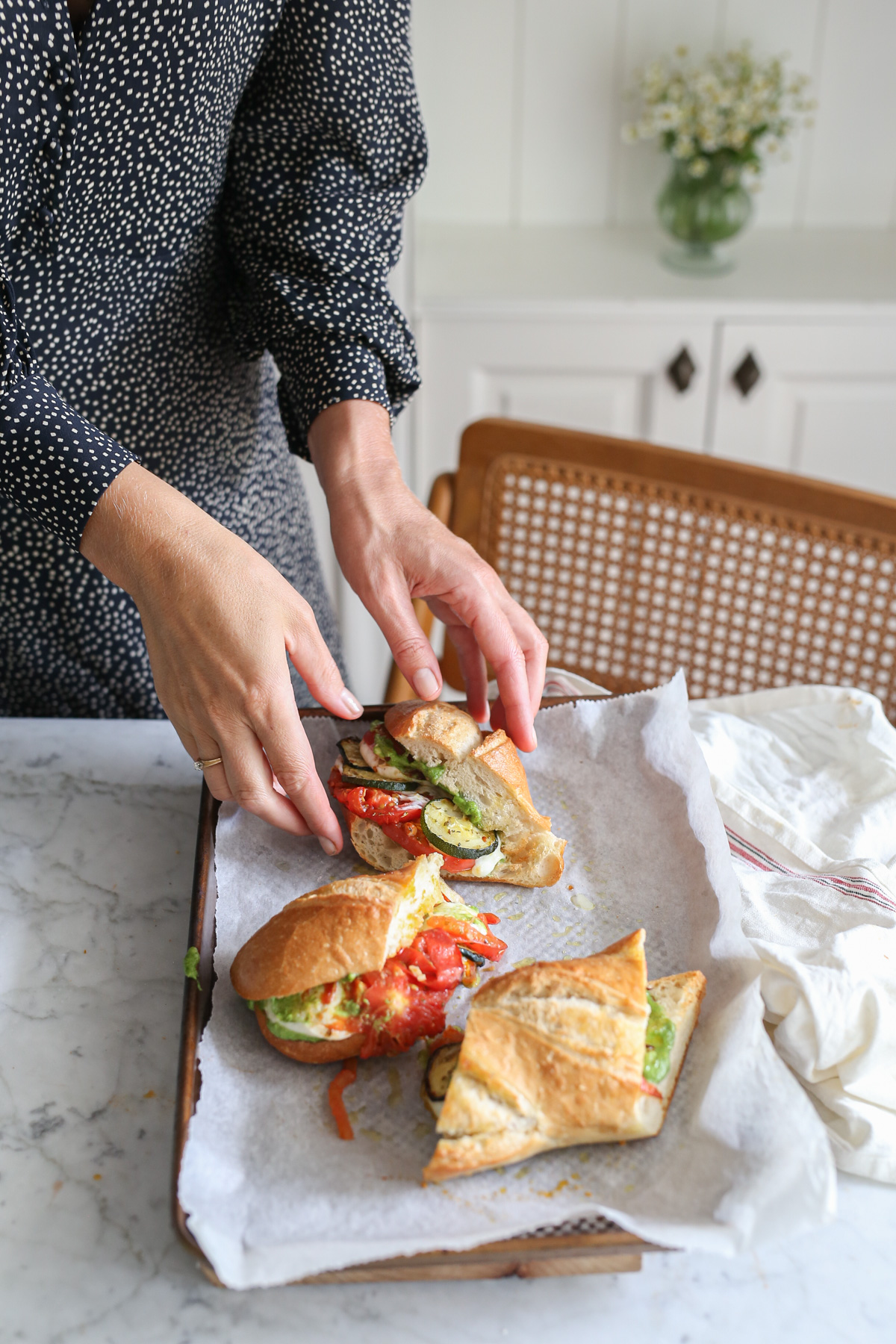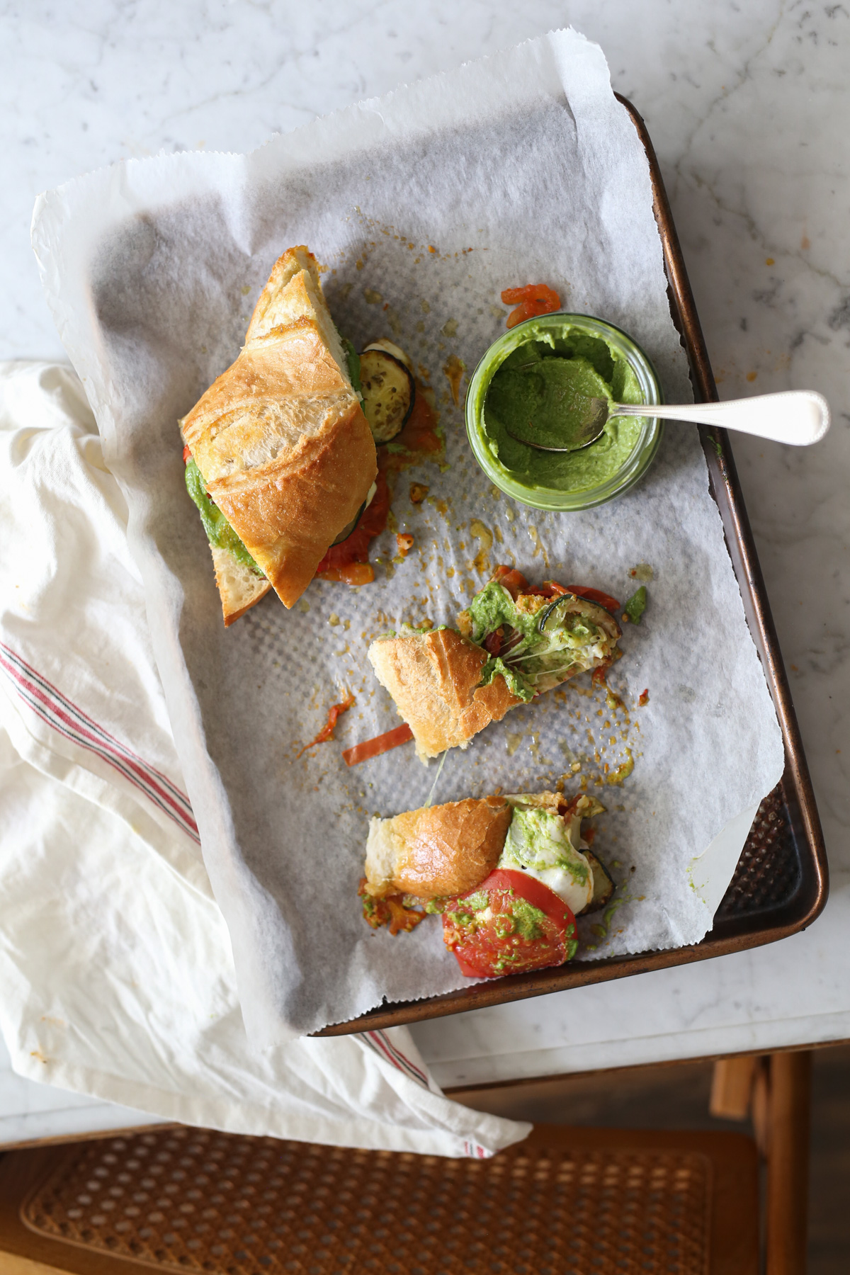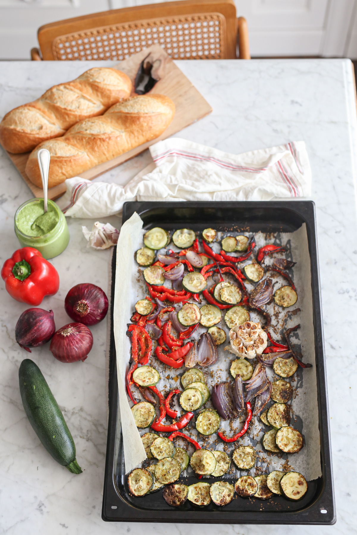 - Bułkę paryską kroimy na pół i rozsmarowujemy domowe pesto (patrz przepis powyżej). Następnie nakładamy pieczone warzywa i ser mozzarella (warstwa po warstwie). Tak przygotowaną kanapkę pieczemy kilka minut, aż mozzarella się roztopi a wierzch pieczywa zrobi się chrupiący. Podajemy na ciepło z dodatkową porcją pesto.