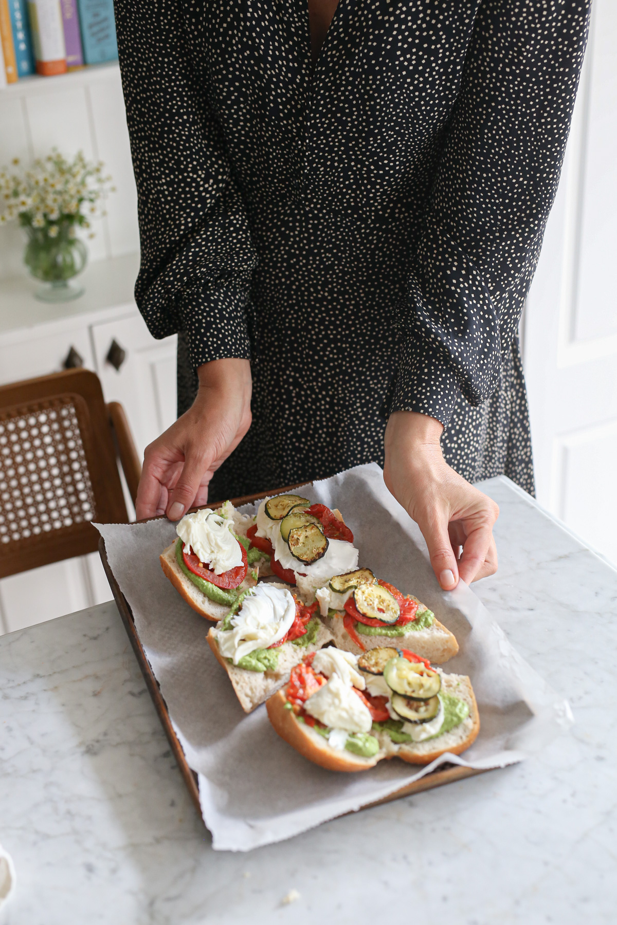 Grzanka z bułki paryskiej z pieczonymi warzywa, domowym pesto z rukoli i serem mozzarella.