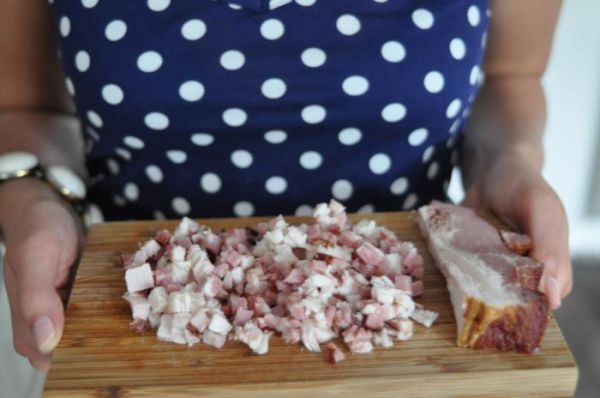Na rozgrzanej patelni smażymy pokrojony w kostkę boczek wraz z pokrojoną w cienkie plastry cebulą. Doprawiamy szczyptą soli, świeżym pieprzem oraz mielonym chili).