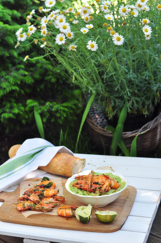 1. Krewetki dokładnie myjemy i osuszamy ręcznikiem papierowym. Na rozgrzanej patelni rozpuszczamy masło i delikatnie podsmażamy czosnek z chili. Patelnię odstawiamy z ognia, dorzucając posiekane liście bazyli i pietruszki. Osuszone krewetki przekładamy na patelnię i zamaczamy w mieszaninie czosnkowo – maślanej. Doprawiamy solą i pieprzem. Pozostawiamy na ok. 45 minut, aż krewetki nasiąkną smakiem. Po upływie czasu smażymy po 1 minucie z każdej strony. Podajemy od razu z bagietką i świeżym guacamole.