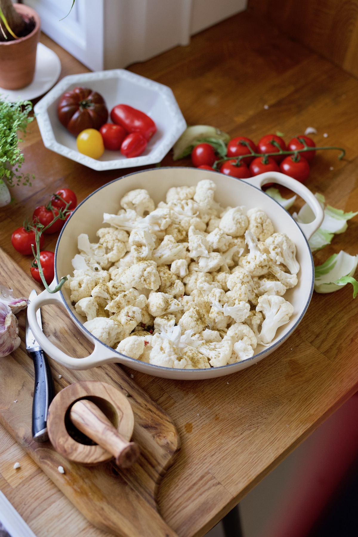 Upieczony kalafior mieszamy z podsmażonymi pomidorkami, doprawiamy (jeżeli trzeba) dodatkową porcją kminu i posiekaną pietruszką.