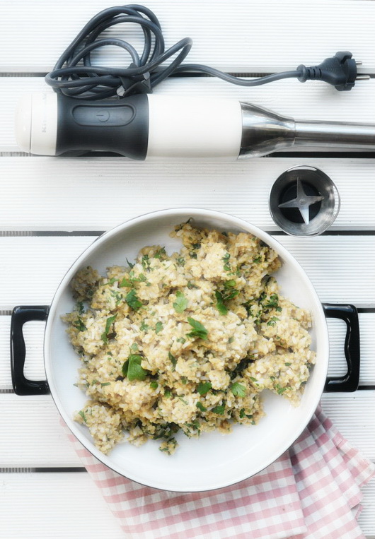 2. Całość (warzywa + mięso + bulion) dokładnie miksujemy za pomocą blendera. Dodajemy ugotowany ryż i mieszamy. Doprawiamy wg uznania (dzieci lubią potrawy ze smakiem) i posypujemy posiekaną natką pietruszki. Naleśniki napełniamy farszem i zawijamy. Przed podaniem kroimy na małe porcje.