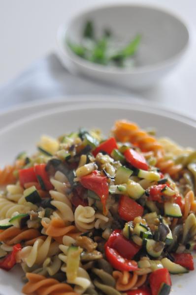 1. Gotujemy makaron al dente w dużym naczyniu z wrzącą, osoloną wodą. Wszystkie warzywa kroimy w drobną kostkę (bakłażan, cukinię, paprykę) i smażymy na rozgrzanej patelni. Dodajemy wyciśnięty czosnek, bazylię, imbir. Doprawiamy pieprzem i solą. Skrapiamy oliwą z oliwek. Smażone warzywa mieszamy z ugotowanym makaronem. Przed podaniem posypujemy świeżymi listkami mięty.
