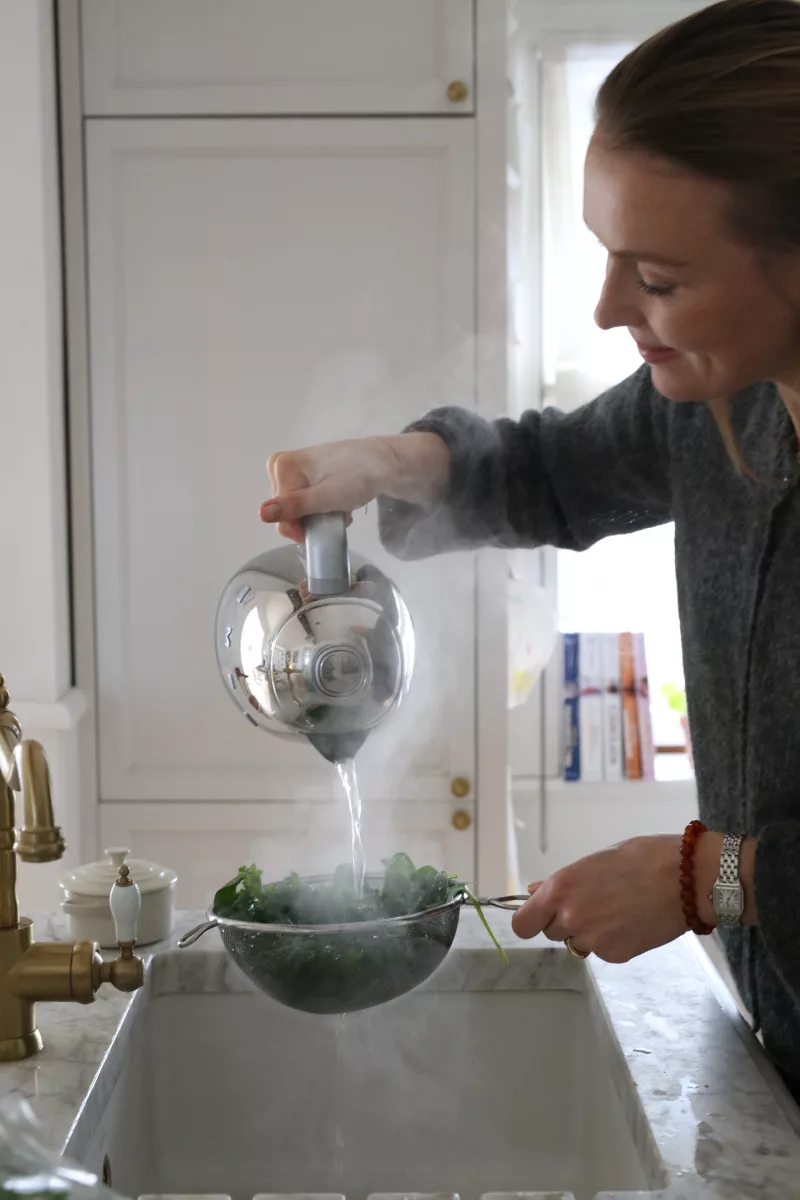 1. Szpinak i jarmuż parzymy wrzątkiem przez około minutę, następnie odcedzamy i hartujemy w zimnej wodzie. Dokładnie odciskamy z nadmiaru wody. Przekładamy do kielicha blendera, dodajemy sok z cytryny, oliwę z oliwek oraz szczyptę soli. Blendujemy na gładki, zielony sos i odstawiamy.