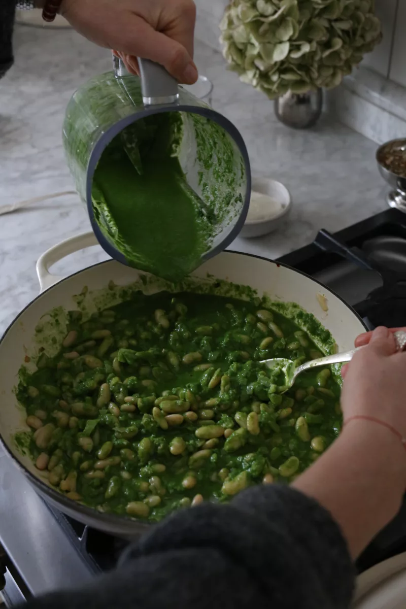 2. Cebulę drobno siekamy i szklimy na patelni z oliwą. Dodajemy posiekany czosnek oraz płatki chili i krótko podsmażamy, aż uwolnią aromat. Fasolę odsączamy, płuczemy i dodajemy na patelnię. Delikatnie podgrzewamy, mieszając, aby połączyła się z cebulą i czosnkiem. Wlewamy zblendowany sos ze szpinaku i jarmużu do fasoli. Delikatnie mieszamy i podgrzewamy na małym ogniu. Doprawiamy solą i pieprzem do smaku. Zdejmujemy patelnię z ognia, dodajemy startą skórkę cytrynową, posiekany koperek i burratę. Podajemy z chrupiącą grzanką.