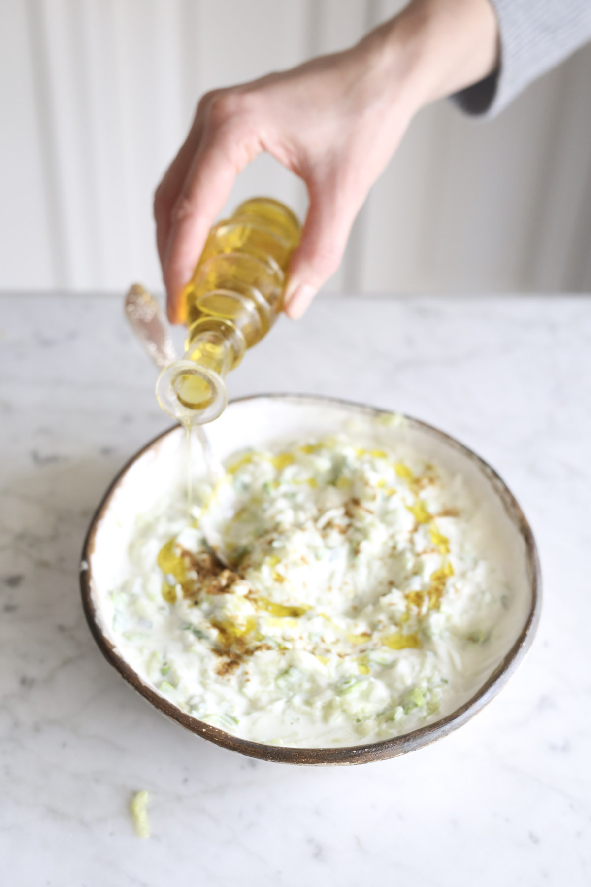 - Aby zrobić sos: ogórki obieramy ze skórki i ścieramy na tarce, odsączamy sok, a starty miąższ przekładamy do salaterki. Dodajemy jogurt i przyprawy. Całość dokładnie mieszamy. Doprawiamy solą i świeżo zmielonym pieprzem według własnego smaku.