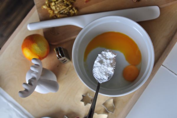 1. Żółtka ucieramy z cukrem oraz skórką pomarańczową. Na stolnicy ucieramy mąkę z masłem, a następnie dodajemy utarte żótka i wyrabiamy ciasto, aż do uzyskania miękkiej i jednolitej masy. Umieszczamy do lodówki na 30 minut.