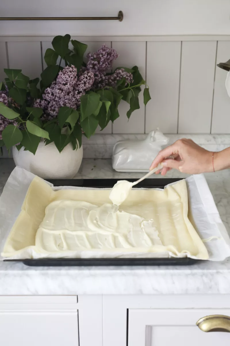 1. W misce łączymy mascarpone, skyr, philadelphię, cukier puder oraz jajko. Całość mieszamy do uzyskania jednolitej masy. Na blasze do pieczenia wykładamy papier i rozkładamy ciasto filo. Wierzch ciasta smarujemy przygotowanym kremem po same brzegi i układamy pokrojone w plastry truskawki. Pieczemy w rozgrzanym piekarniku do 200 stopni C przez 20 min. Podajemy na ciepło.