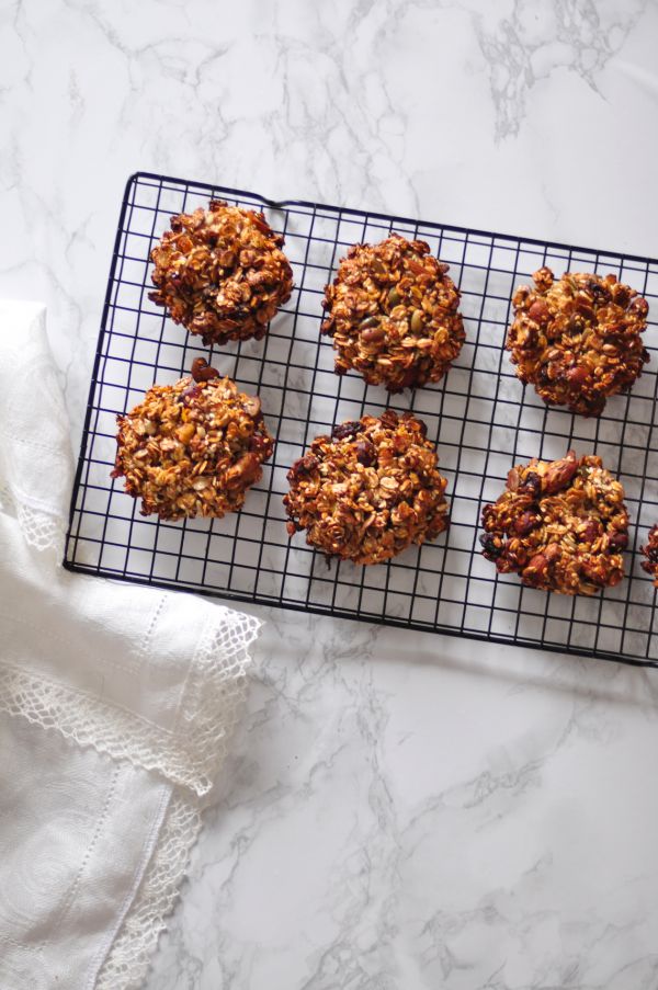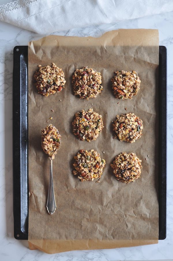 Kawa powoli sączy się z ekspresu. Gorące mleko czeka na stole, a w piekarniku ciasteczka zbożowe nabierają złocistego koloru – taki planuję sobotni poranek. Przepis jest jak zwykle prosty – wystarczy dokładnie wymieszać wszystkie składniki i rozgrzać piekarnik do 200 stopni C. Ciastka pieką się niesłychanie szybko (jedynie 12-15 minut). Nie zawierają mąki ani cukru (jeżeli ktoś jest uczulony na jajka, to można zmniejszyć ilość do 1, lub zastąpić bananem). Możemy je spożywać z konfiturą, masłem lub tak jak ja – zalać ciepłym mlekiem.