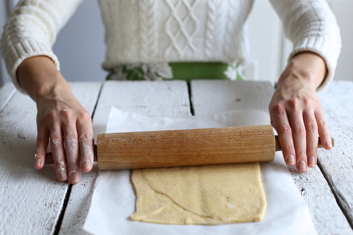 Kiedy ciasto podwoi objętość formujemy z niego 4-5 kulek. Każdą kulkę rozwałkowujemy na stolnicy (ciasto może być klejące – ale o to chodzi – wystarczy oprószyć sobie dłonie mąką). Z ciasta formujemy prostokąt.
