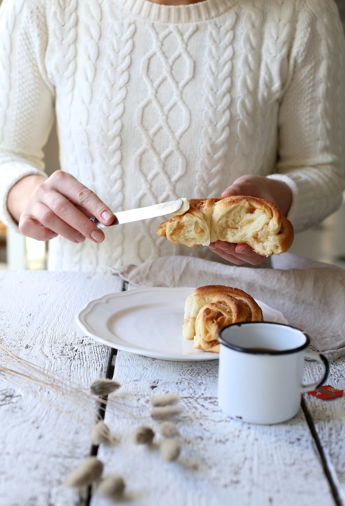 A gdyby tak upiec wieńce na słodko? Taka myśl naszła mnie kilka dni temu dzięki Waszym zdjęciom oznaczonym na moim profilu instagramowym. Muszę Wam przyznać, iż odkąd opublikowałam przepis na wieniec drożdżowy, to nie ma dnia w którym nie otrzymywałabym od Was zdjęć Waszych wypieków. Są wspaniałe! Niektóre zdecydowanie lepsze od mojego prototypu :P Pomyślałam sobie zatem, że może i wersja na słodko też się przyjmie? Idea zawijania jest identyczna – jedynie ciasto ma inne proporcje (jest bardziej maślane i zawiera jajka). Na ciepło. Na śniadanie z lekko schłodzonym masłem – idealne!