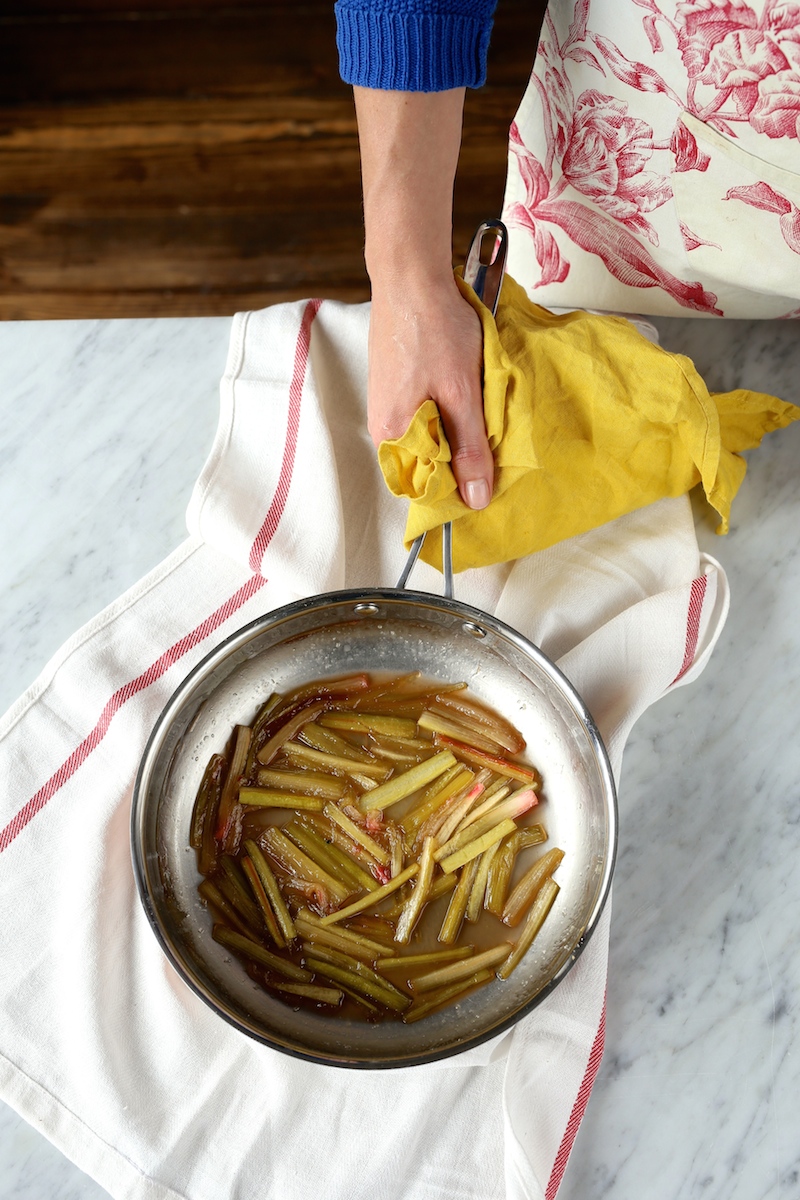 Umyty i obrany rabarbar kroimy w paski (patrz na zdjęciu) o długości ok. 3 cm i zasypujemy cukrem. Odstawiamy na kilka minut, aż puści sok. Następnie na rozgrzanej patelni dusimy rabarbar ok. 3-4 minuty.