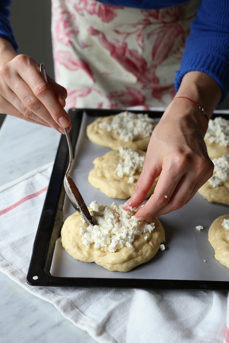 Wyrośnięte ciasto ponownie zagniatamy i dzielimy na 6-8 kulek. Każdą kulkę spłaszczamy i rozkładamy na niej twaróg z duszonym rabarbarem.