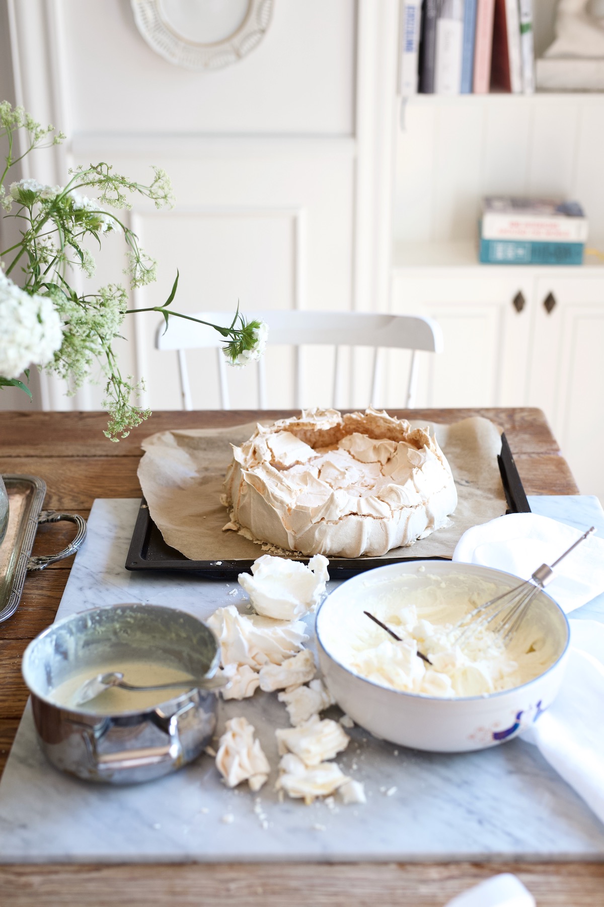 Tydzień temu przez nasz dom przewinął się huragan soczystej energii zerówkowiczów. Wyprawialiśmy siódme urodziny Hanusi. Tego dnia pogoda cudownie dopisała, więc większość konkursów odbyła się w ogrodzie. Kilkadziesiąt balonów napełnionych wodą (o zgrozo!), zwisające z gałęzi drzew jabłka na sznurku, przygotowane akcesoria plastyczne do dekorowania masek… ostatnie trzy lata nauczyły nas pełnej gotowości! Bo, gdy o zaplanowanej godzinie odwiedza Cię dwudziestu paru sześciolatków, to nie czas na improwizacje. Mówię całkiem serio :). I z ciastem też musi być jasność – albo biszkopt z owocami i galaretką truskawkową albo beza. Krucha, w środku lekko ciągnąca się z kremem z białej czekolady i owocami. Choć zwykle się mówi, że dzieci za urodzinowymi ciastami nie przepadają, to w przypadku tej bezy nawet grama okruszków dla wykończonych rodziców nie pozostało.