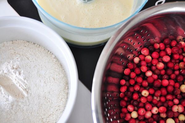 2. W mikserze ucieramy masło z cukrem pudrem i cukrem wanilinowym na gładką masę, stopniowo zmniejszamy prędkość i dodajemy jajka oraz mleko. Zawartość wyjmujemy z miksera i łączymy za pomocą dużej łyżki pozostałe składniki, czyli mieszankę mąki z proszkiem do pieczenia i szczyptą soli. Na końcu dodajemy żurawinę. Wszystkie składniki powinny być dobrze wymieszane.
