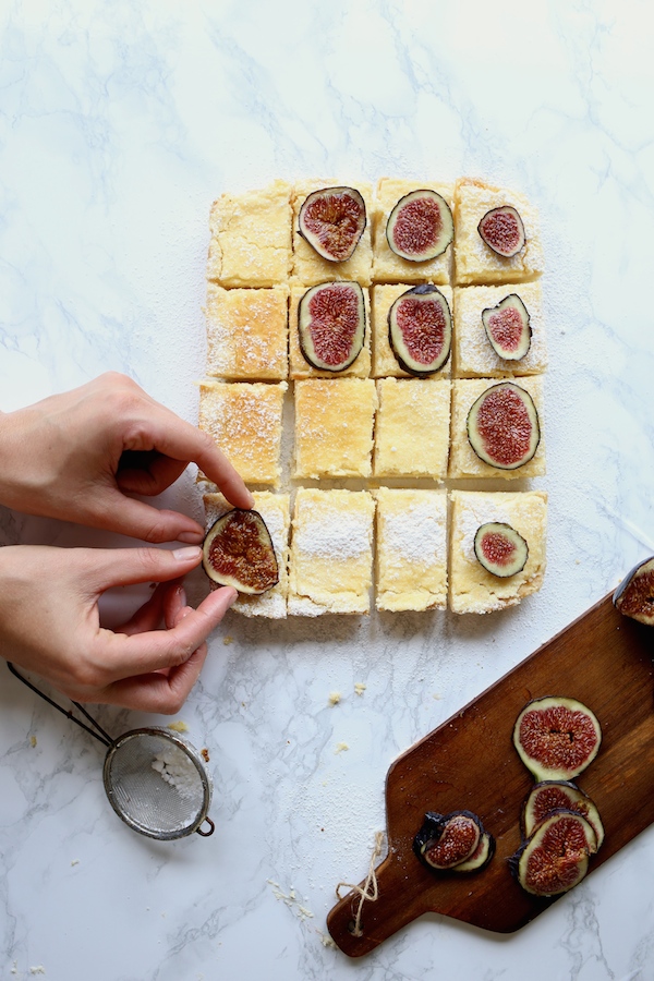 3. Schłodzoną śmietankę ubijamy na sztywną pianę. Następnie dodajemy jajka, sok z cytryn, cukier i otartą skórkę cytrynową. Całość delikatnie mieszamy tylko do połączenia się składników i przelewamy na kruchy spód. Umieszczamy ponownie w rozgrzanym piekarniku do 190 stopni C przez 20 minut lub do ścięcia się wierzchu. Upieczoną tartę wyjmujemy z piekarnika i przekładamy na kratkę cukierniczą. Dekorujemy plastrami świeżej figi i posypujemy cukrem pudrem.