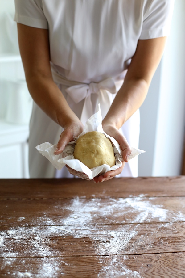 1. Wszystkie składniki na kruche ciasto umieszczamy w naczyniu i zagniatamy. Z ciasta formujemy kulę, owijamy w lnianą serwetkę i schładzamy w lodówce przez 30 minut. Po wyjęciu z lodówki ciasto rozwałkowujemy (najlepiej na papierze do pieczenia). Skrawek ciasta pozostawiamy na później (na przykrywkę). Pozostałą część wraz z papierem przenosimy nad formę. Obracamy i delikatnie wykładamy ciastem formę (wcześniej wysmarowaną masłem i oprószoną mąką). Nakłuwamy widelcem i umieszczamy w rozgrzanym piekarniku w 180 stopniach C przez ok. 20 minut lub do momentu, aż spód lekko zbrązowieje. Wyjmujemy z piekarnika i odstawiamy.