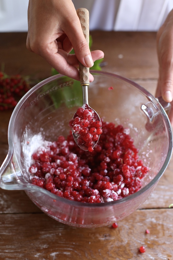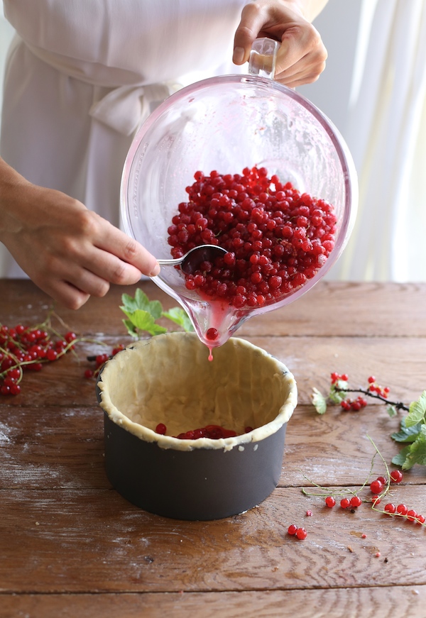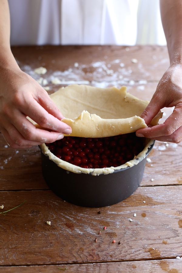 Komentarz: Możemy zrezygnować z wstępnego podpiekania spodu i od razu przełożyć owoce na surowy spód – w tym przypadku ciasto powinno się piec 45-50 minut w 190 stopniach C (ale jest większe prawdopodobieństwo, że spód może być lekko niedopieczony). Porzeczki puszczają bardzo dużo soku, więc w trakcie krojenia ciasta trzeba być ostrożnym (polecam odlać sok i wykorzystać do herbaty). Jeżeli w trakcie wałkowania, ciasto będzie nam się rozpadać, proponuję zrezygnować z wałka i ręcznie wyłożyć ciastem formę. Żeby spód po upieczeniu był nadal kruchy, możemy przed nałożeniem owoców posypać bułką tartą.
