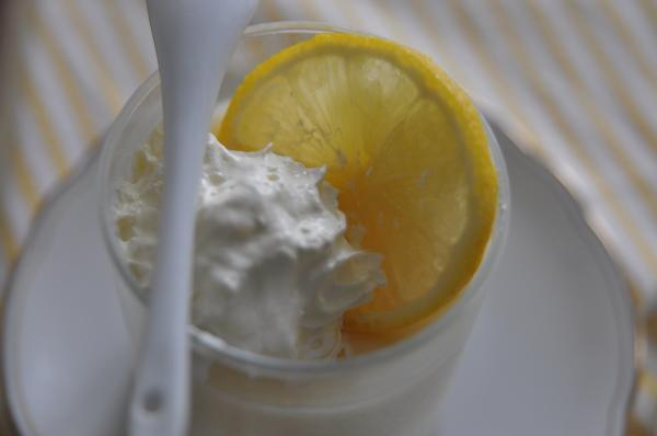 2. Żelatynę rozpuszczamy w 2 łyżkach wrzącej wody i dodajemy do masy jajecznej. Dokładnie mieszamy, żeby uniknąć tzw. grudek. Odstawiamy z ognia i dodajemy masło. Mieszamy. Białka ubijamy ze szczyptą soli na sztywną pianę i dodajemy do masy cytrynowej. Ostrożnie mieszamy składniki i przelewamy do małych szklanek. Zabezpieczamy folią aluminiową i odstawiamy do lodówki na min. 4 godziny. Możemy podać z bitą śmietaną i plastrami świeżej cytryny.