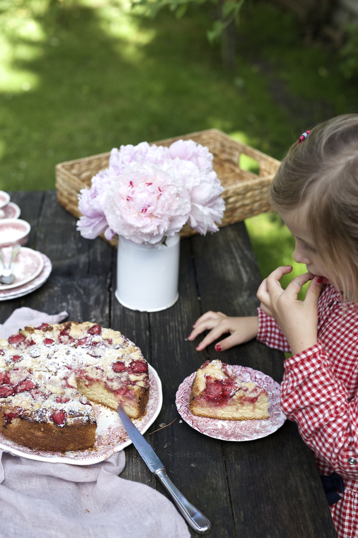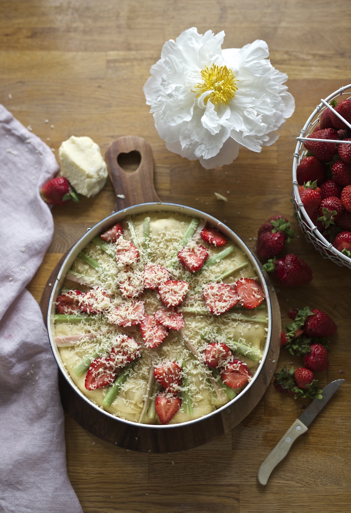 - Wyrośnięte ciasto przekładamy do natłuszczonej formy do pieczenia, na wierzch ciasta rozkładamy kawałki rabarbaru, truskawki i marcepan. Posypujemy startą kruszonką. Zazwyczaj pozostawiam jeszcze ciasto na 10 minut do ostatecznego wyrośnięcia, a następnie piekę w rozgrzanym piekarniku w 180 stopniach C (opcja: góra-dół) przez ok. 55 do 60 minut.
