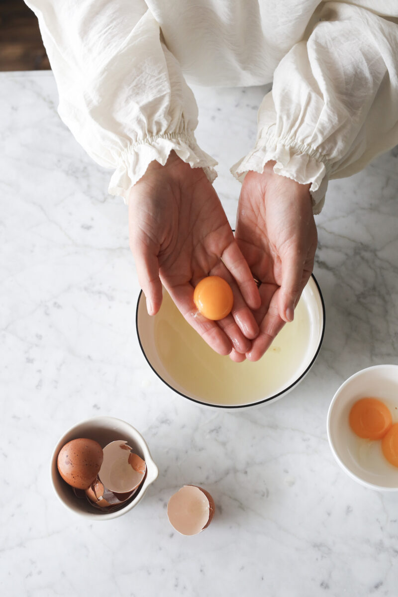 - Aby zrobić bezę: białka ubijamy na sztywną pianę – w połowie ubijania, stopniowo łyżka po łyżce dodajemy cukier. Po paru minutach, gdy piana stanie się gęsta i błyszcząca dodajemy mąkę ziemniaczaną i miksujemy jeszcze chwilkę.